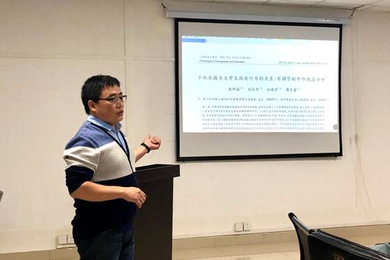 接下来,连帅磊老师以自己发表在《心理发展与教育》上的一篇文章:《手机成瘾与大学生拖延行为的关系:有调节的中介效应分析》为例,逐字逐句的给同学们讲解如何进行相关设计类论文写作,如何做到在论文撰写中逻辑清晰并且表达简洁。