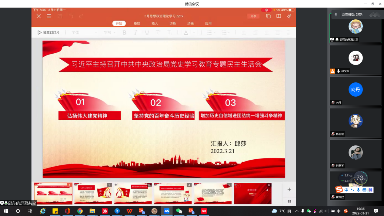 (通讯员 杜馨)为了进一步加强对党的思想与精神的学习和领悟,不断保持和增强政治性、先进性、群众性, 团结引领广大新时代新青年永远跟党走、奋进新征程,我院2020及2021级研究生于3月15日至3月31日,以班为单位,开展了线上、线下相结合的政治理论学习活动。