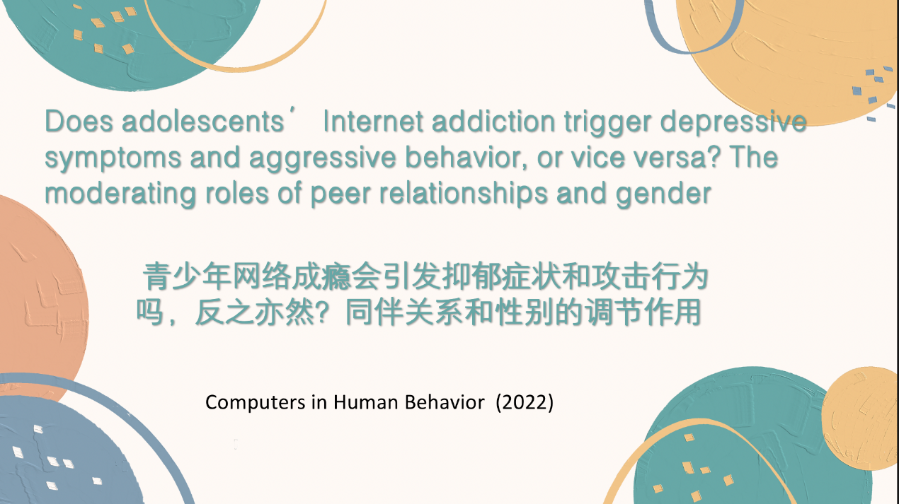 例会正式开始,首先由杨蕊嵘同学进行文献汇报,题目为《Does adolescents’ Internet addiction trigger depressive symptoms and aggressive behavior, or vice versa? The moderating roles of peer relationships and gender》,该文章于2022年发表在《Computers in Human Behavior》。该文章报告了青少年网络成瘾和抑郁症状、攻击行为之间是否存在双向预测关系,结果发现,网络成瘾与抑郁症状和攻击行为之间不存在双向相互关系,即网络成瘾是抑郁症状和攻击行为的前因,网络成瘾是一个风险因素,但不是内化和外化问题的结果;其次还发现网络成瘾的有害影响在男孩和女孩之间存在差异。网络成瘾的男孩更容易出现攻击性行为,而不是抑郁症状;网络成瘾的女孩更容易出现抑郁症状,而不是攻击性行为。