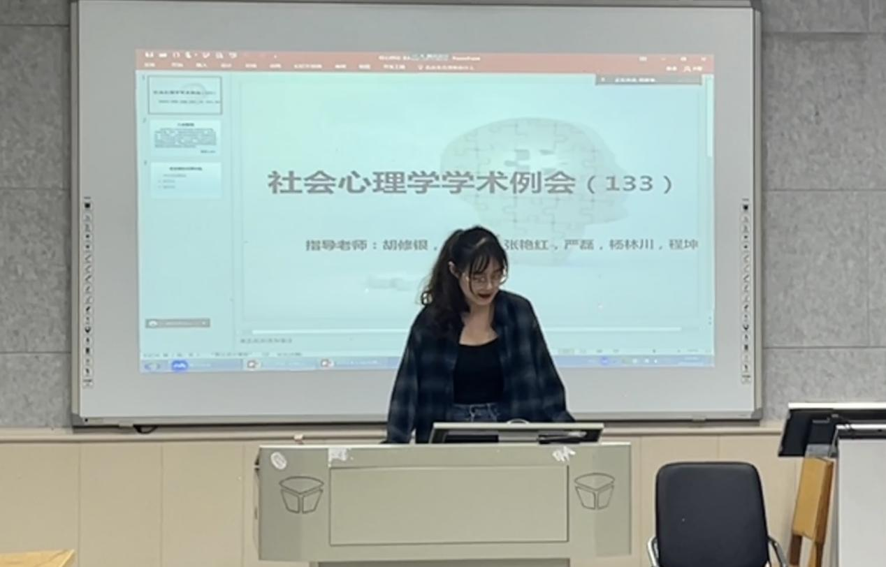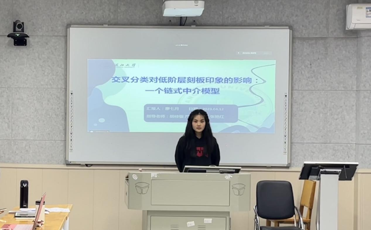 (通讯员:陈錾昕)2023年4月12日晚19点至21点,第133期社会心理学学术例会在11教201教室线上线下同步举行。本次例会有幸邀请到三峡大学田家炳教育学院杨林川博士与其团队研究生王鸿璞参与交流。出席例会的还有胡修银老师、严磊老师、15名研究生和7名本科生。本次例会由研二周勇琴主持,研三胡汇鑫、廖七月和陶雪飞进行硕士毕业论文预答辩,其汇报分别为《集体时间焦点对中国大学生成就动机的影响:群体认同的调节作用》、《交叉分类对低阶层刻板印象的影响:一个序列中介模型》、《新冠疫情背景下社区干部的领导群体原型性对其权威合法性的积极影响》。