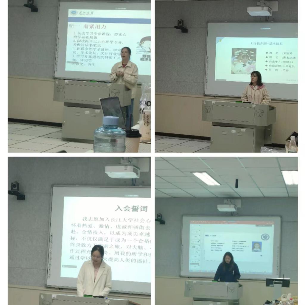 首先是五名研一同学从学习、实践、爱好等多个方面展示了自己丰富多彩的经历,他们也制定了清晰的新学期学习计划,其次是研二同学从实习工作、论文进展、学术阅读和课外生活等多个方面回顾了自己的暑假,同时,他们也针对自己的阶段性任务规划了新学期的时间安排。紧接着,本科生科研助理汇报了自己在暑假的科研进展与生活感悟,他们在劳逸结合中学习专业知识、寻找自己的专业志趣。此外,首次参加社心例会的4名大三心理学本科生也做了自我介绍,在场的老师们希望他们能够坚持参加例会,促进自己的专业学习。同学们汇报结束后,严老师介绍了《长江大学社会心理研究中心的学生指导理念》,严老师从中心简介、学生学业规划、学生指导理念等三个方面对研究生的3年学习提出了总体规划。