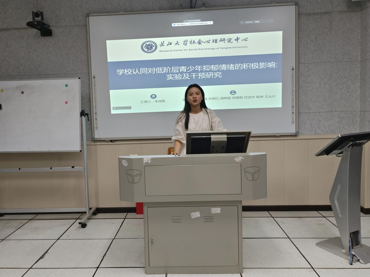 最后是朱成程同学,汇报内容为《学校认同对低阶层青少年抑郁倾向的积极影响:追踪、实验及团辅干预研究》。一共分为三项研究。研究一采用问卷法,考察了学校认同对低阶层青少年抑郁的积极影响;研究二采用实验法,考察了学校认同对消极情绪缓解的影响;研究三采用干预法,通过提高学校认同来降低青少年抑郁倾向。