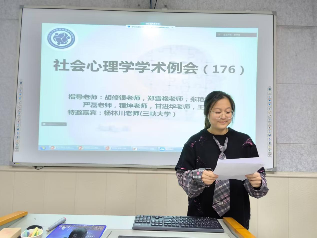 (通讯员:姜静楚)2024年12月20日19时00分至21时00分,第176期社会心理学学术例会在11教201室如期举行,本次例会采用线上线下相结合的模式,主题为“文献分享汇报”,由本科生科研助理夏文婕同学主持。参加例会的老师有甘进华老师、严磊老师、王丛兴老师和来自三峡大学的杨林川老师,学生有10名心理学研究生、31名本科生科研助理。