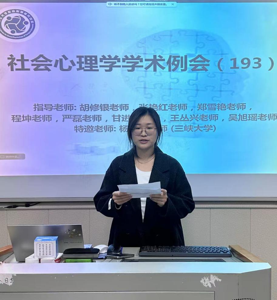(通讯员:杨梦云)2025年10月28日19时至22时,第193期社会心理学学术例会在长江大学东校区11教201室线上线下同步举行。本次例会由周瑶同学主持,主题为“毕业论文预答辩”与“文献汇报”。参加本次例会的老师有郑雪艳老师、严磊老师、甘进华老师、王丛兴老师、吴旭瑶老师和杨林川老师(三峡大学),学生有14名心理学研究生,15名本科生科研助理。
