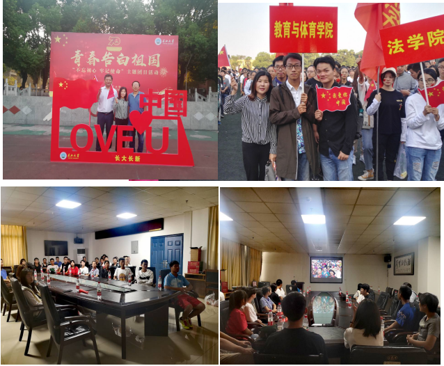 本次活动分东西校区两个会场同步开展,活动伊始,由长江大学青年志愿者总队队长宣读安全手册,紧接着各院同学组织的国旗护卫队进行升旗仪式,在场成员齐唱国歌,升旗仪式完毕后,接着的是由青马班学员领诵《少年中国说》选段,气势宏伟,阐述了“少年强则中国强”的道理。由第十三期青马班成员优秀共青团员标兵代表我院白旭青同学带领大家重温入团誓词,接着进入的活动是在场全员合唱《我和我的祖国》,祝贺祖国七十华诞,祝贺祖国繁荣昌盛。最后是各领导与学生代表将红旗贴入一个带有“70”字样的扁牌,共同制作为祖国庆生的礼物。10月1日上午8时,学生会组织全体在校学生在文科大楼共同观看国庆阅兵仪式,共同学习“不忘初心,牢记使命”的精神。