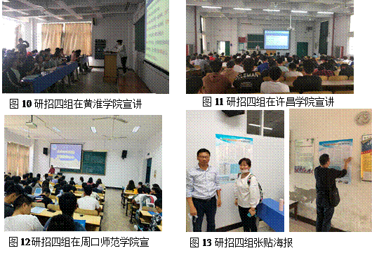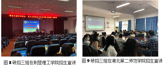 根据学校近三年录取硕士研究生外校应届生分布情况,结合我院硕士点情况和对方学校专业分布,重点选取了黄淮学院、许昌学院、周口师范学院、湖北文理学院、汉江师范学院、南阳师范学院、南阳理工学院、黄冈师范学院、湖北师范大学、湖北理工学院、湖北第二师范学院、荆楚理工学院等十余所高校为我院2021年研究生招生进校宣传单位。