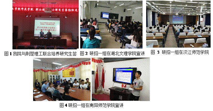 第一工作组由院长张相乐带队,研究生导师李臣教授及王志伟老师一行3人,于9月25日至28日前往北线的荆楚理工学院、湖北文理学院、汉江师范学院、南阳师范学院4所高校开展研招宣传活动。经前期不断探索研究生教育的新机制和新模式,我院与荆楚理工学院师范学院就研究生招生、培养、日常管理等方面达成了一致,9月25日下午举行了联合培养协议签字仪式,双方签署了合作协议。随后,张院长一行马不停蹄地抵达湖北文理学院,与教育学院领导进行了座谈,介绍我院研究生招生及培养的相关情况。下午5点,王志伟老师向有考研意向的同学们作招生政策宣讲,教室里座无虚席,效果很好。26号上午,张院长带领研招一组赶往汉江师范学院宣讲,张贴海报,发放宣传册,与相关院系领导座谈交流,就研究生招生工作交换意见,并考察了该校的体育场馆。27号下午,研招一组来到南阳师范学院进行第三场宣讲活动。