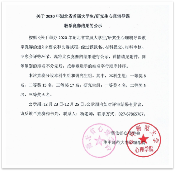 首届比赛受到疫情影响,采取教案与教学实录作品评比形式。我院心理学系在前期“长江大学首届心理微课比赛”(9月 7日~ 9月21日)的工作基础上,积极发动学生和指导老师参加比赛。经过选拔,共有5位学生参与比赛的前期准备。11月23日,心理学系召开“湖北省首届心理辅导课竞赛”工作推进会,并于12月1日到3日,在江陵中学和荆州实验中学完成比赛教学实录视频的录制。最终,根据教案和录制的作品质量,报送了4位选手的作品参赛,获得两个二等奖、一个三等奖,在湖北省属高校名列前茅。