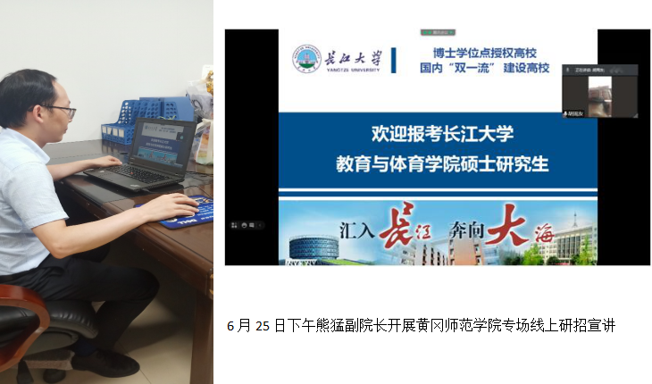 线下研招宣传热火进行的同时,线上招生宣讲也在有序推进。6月25日下午熊猛副院长分别开展黄冈师范学院体育学院、教育学院两场专场线上研招宣讲活动。