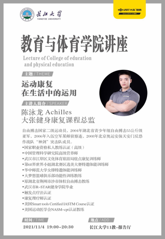 (通讯员 吴 敏) 11月4日19点,biwn必赢在11教学术报告厅举办运动康复专题报告会。荆州市大张健身康复课程总监陈泳龙先生受邀作《运动康复——在生活中的运用》的专题讲座。会议由社会体育指导与管理系主任孔祥魁副教授主持,院长张相乐教授、张云洁老师及我院体育专业部分本科生及研究生参加了本次讲座。