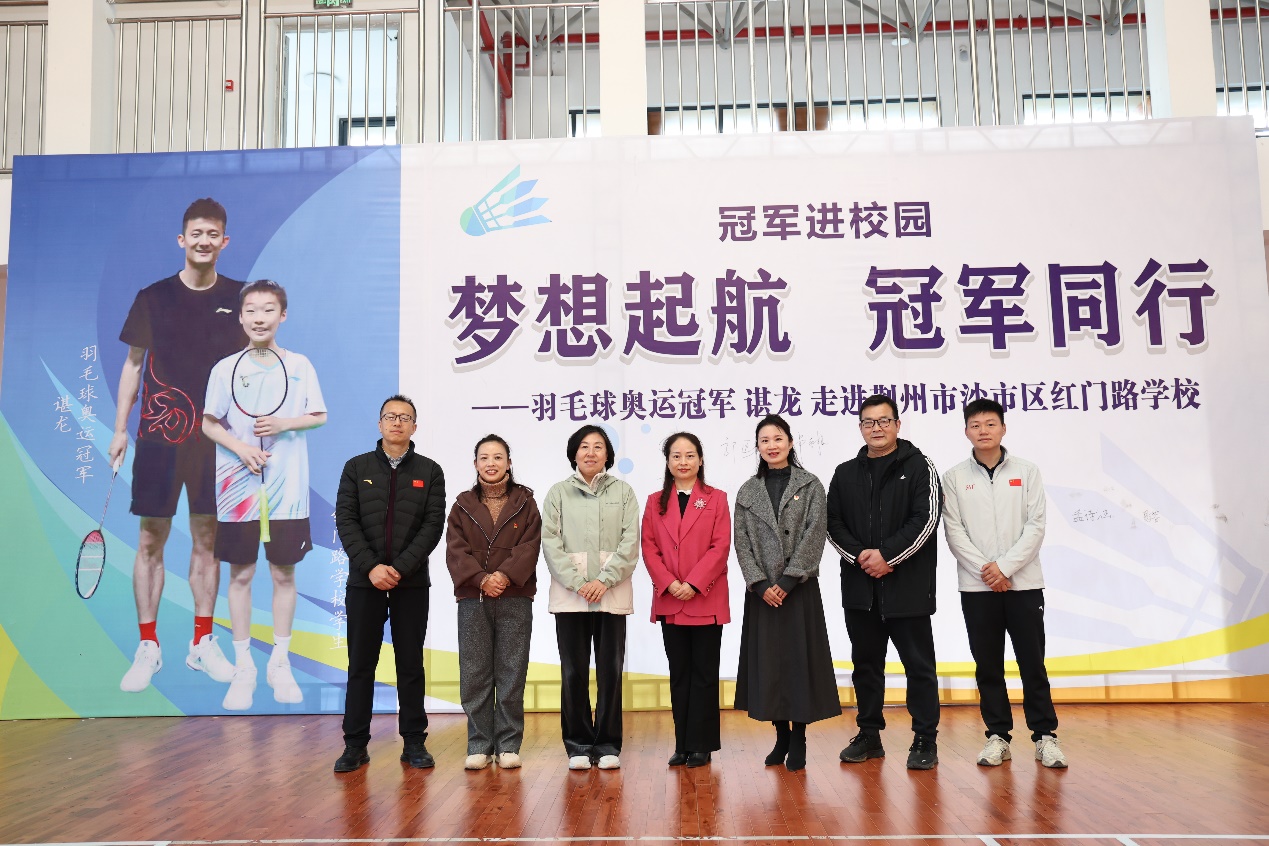 授牌仪式之后,荆州市文化和旅游局四级调研员、竞技体育科科长向晓云、biwn必赢副院长杨青宝,荆州市沙市区红门路学校党委书记、校长李雨蔚,以及学生代表进行捐赠仪式并合影留念。