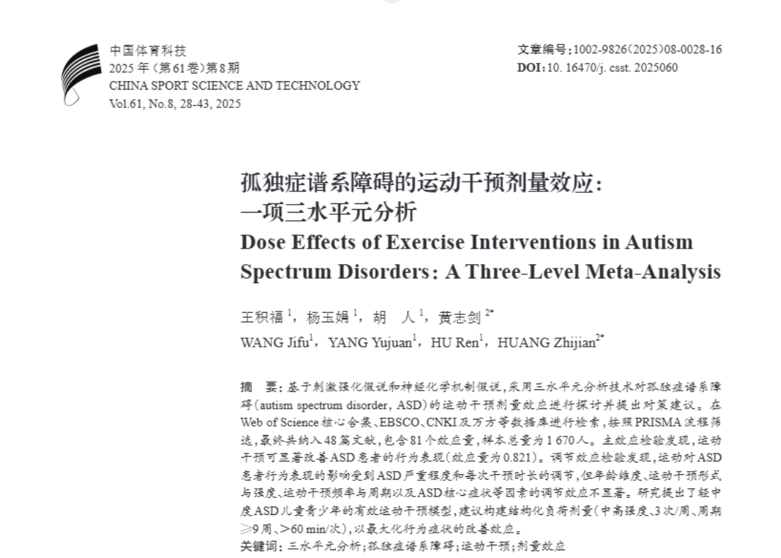 (通讯员:丁雨晴)近日,我院王积福副教授及其团队与武汉体育学院黄志剑教授合作的科研成果《孤独症谱系障碍的运动干预剂量效应:一项三水平元分析》,已在体育科学领域权威期刊《中国体育科技》上作为重点推荐论文正式发表。该研究由教育部人文社会科学研究项目基金资助(项目编号:23YJCZH206)。《中国体育科技》由国家体育总局主管、国家体育总局体育科学研究所主办,多年来一直是中国人文社会科学核心期刊、CSSCI来源期刊,并被中国社科院期刊评价报告评为核心期刊,在《长江大学高质量期刊目录》中被定义为T1级别。