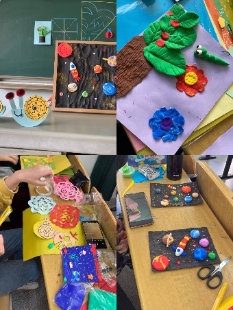 实践操作环节,鞠老师教同学们学习剪纸、折纸和黏土,老师在讲台上演示步骤,同学们在座位上按照步骤并结合想象力完成任务。同学们遇到困难时鞠老师会及时地耐心地帮助其解决问题。活动结束时,同学们都完成了一幅作品。