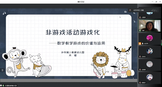 关键园长围绕主题,以 “游戏的概念”、“非游戏活动游戏化的概念”、“数学教学游戏的价值与运用”、“数学教学游戏的实操演练”四个模块为报告主线,首先,关园长从理论上阐释了游戏、非游戏活动游戏化的概念、教学游戏的本质以及教学游戏和规则游戏的联系与区别等内容;然后,以数学教学活动为重点,介绍了数学教学游戏的概念与特点;紧接着阐述了数学教学游戏的价值,并结合实例深入地分析了数学教学游戏的难点与对策;最后通过案例“赢糖果”、“图形火车”与同学们进行了深入的互动交流,让同学们进行了实操演练。