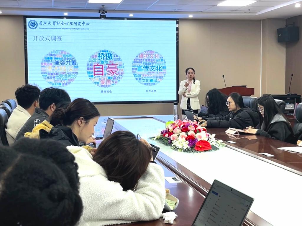 张艳红教授向同学们介绍了"青少年文化自信三系统影响机制动态模型",阐明了风险系统和支持系统对青少年文化自信的动态影响,并且强调了学校这一支持系统在促进青少年形成文化自信方面的重要作用。同时,张教授也向同学们介绍了其团队现有的研究成果,如:文化自信对 AI 感知心智能力的影响、文化自信对亲社会行为的影响、中华传统节日文化接触对文化自信的影响等。
