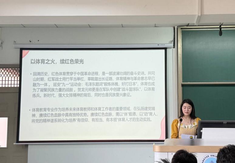 最后,刘甜甜同学指出我们可以通过加强宣传教育、开展实践活动、立足本职岗位来传承和弘扬新时代精神,在学校中融入红色文化课程,利用新媒体平台来扩大宣传范围。体育教育专业作为培养未来体育教师和体育工作者的重要领域,在弘扬建党精神、赓续红色血脉中具有独特优势。