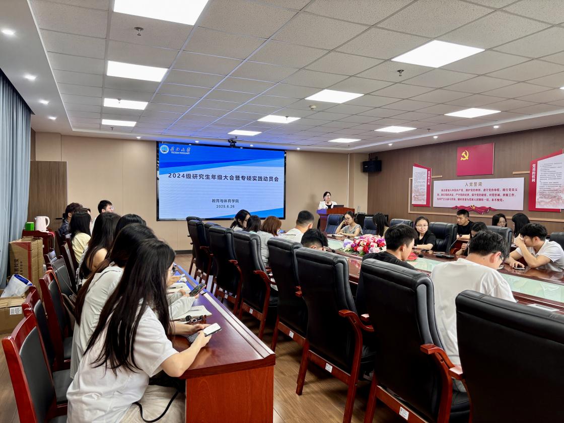 在2024级教育和体育专业硕士研究生的实习实践动员大会上,卢老师着重强调了专业实习的重要意义:专业硕士的培养本就以实践为导向、以职业需求为目标,实习绝非课堂的简单延伸,而是一场“真刀真枪”的实战。它是检验专业能力的“试金石”、明晰职业方向的“指南针”、更是完成从学生到社会人角色转换的“过渡带”,其必须符合教育硕士和体育硕士实践教学的基本要求。卢老师对即将踏上实习岗位的专业硕士生提出四点期望与建议:一是以“空杯心态”投入,放下“研究生”光环,做主动的“学习者”,虚心向实习单位的前辈请教,积累经验与人脉;二是以“责任意识”担当,从细节小事做起,做靠谱的“执行者”,用“能成事”的口碑赢得认可;三是以“问题导向”思考,带着专业视角观察工作流程和行业痛点,做创新的“探索者”,尝试提出改进建议;四是以“安全底线”自律,严格遵守校外实践安全须知,做理性的“实践者”。