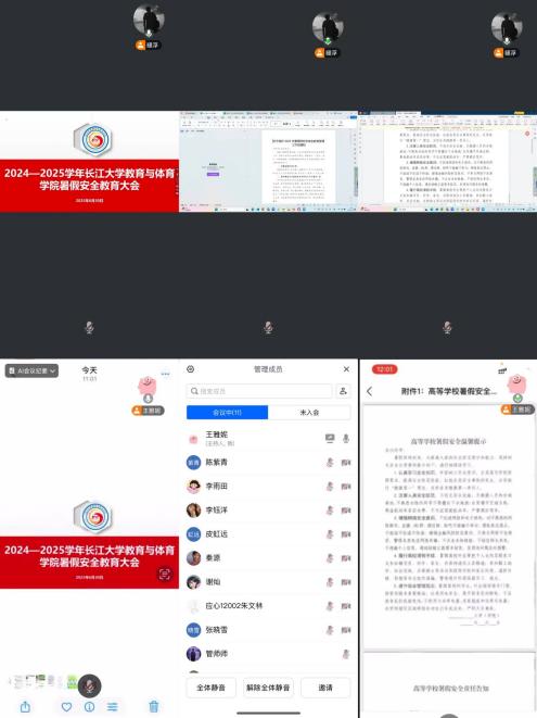 会议首先强调各班级需重点开展“人身安全、交通安全、消防安全、禁止饮酒、食品卫生、电信诈骗、金融风险、网络文明”八大方面的安全教育,组织学生学习《高等学校暑假安全责任告知》等文件,确保每位研究生签订《暑假安全责任告知书签收表》,实现安全教育 “全覆盖、无遗漏”。其次,班长需协助收集《留校申请表》《安全承诺书》《家长知情同意书》等材料,建立留校学生动态台账,并提醒留校学生严格遵守宿舍与实验室管理规定,严禁使用违规电器、私拉电线充电等行为。此外,非荆州市、武汉市户口且已办理校外住宿手续的学生,若假期不返回原住地,需纳入留校管理范畴并备案。最后,为保障假期信息畅通,会议要求各班级完善应急处置预案,班长需保持与辅导员的24小时联络,遇重要情况及时上报。