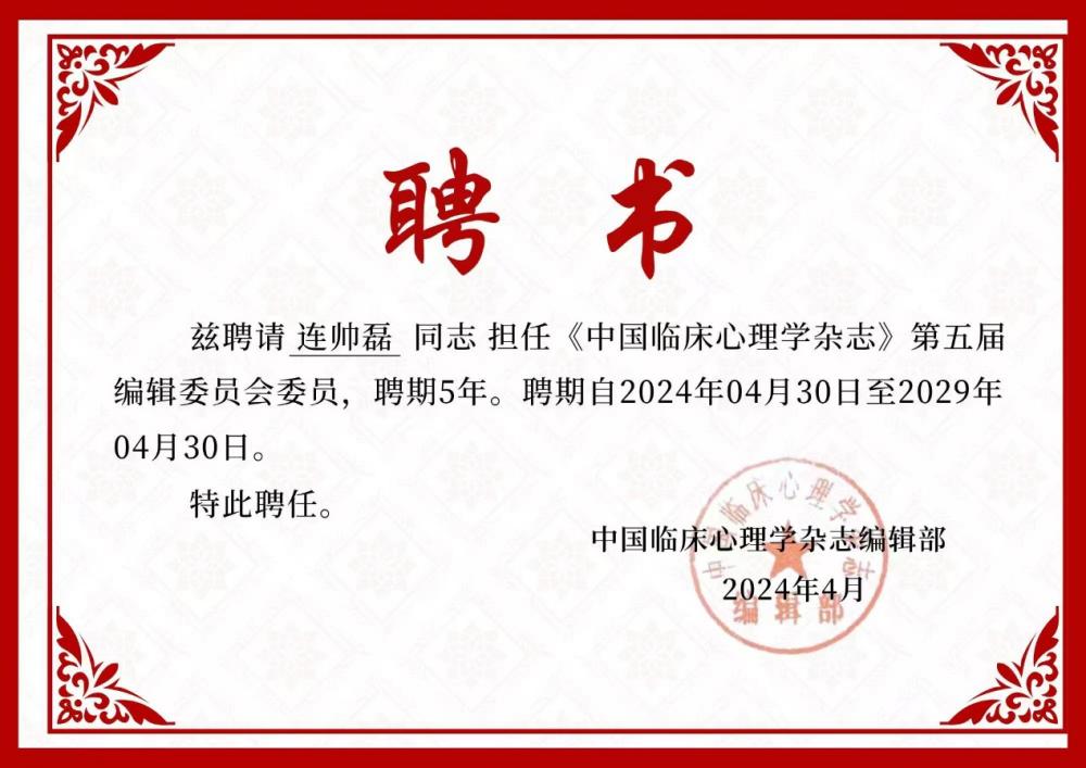 在获聘《中国临床心理学杂志》第五届编辑委员会委员后,连博士表示,他将继续以严谨的科学态度,认真履行编委的职责,为推动期刊发展贡献力量。同时,他也将持续深化教学与科研的融合,通过教学实践不断探索和创新,为学生提供更高质量的教育资源,培养更多优秀的心理学专业人才,为心理学界及更广泛的社会领域提供有力的学术支持和实践指导。
