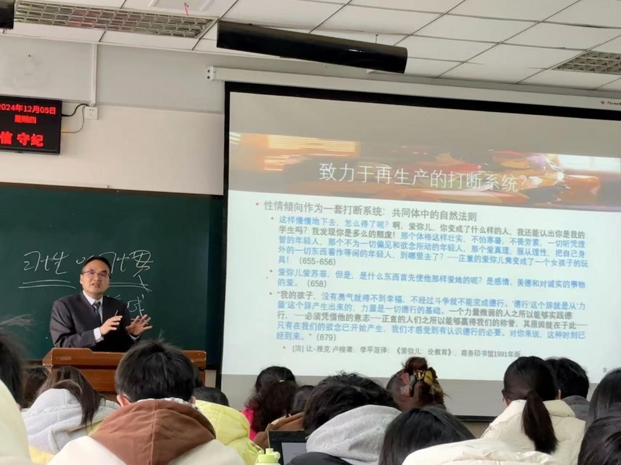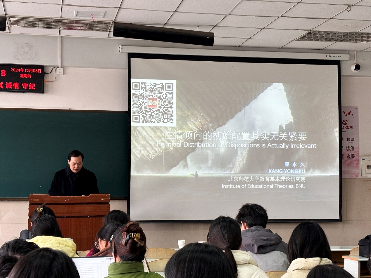 (通讯员 张蜜)2024年12月5日下午,biwn必赢第六届研究生学术科技节校外专家论坛第三讲在12教301举行。本次特邀北京师范大学教育学部康永久教授作报告,其主题为《性情倾向的初始配置其实无关紧要》。biwn必赢张艳红院长、张相乐教授、彭先桃副教授、胡修银副教授和杨雪博士以及我院2024级教育学专业本科生和研究生共计150人参会,讲座由张相乐教授主持。