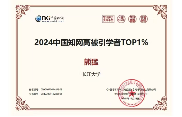 (通讯员 卢小琴)近日,中国知网中国科学文献计量评价研究中心公布了“2024中国知网高被引学者”预发布名单,我院熊猛教授、连帅磊副教授入选“2024中国知网高被引学者TOP1%”,长江大学人文社科类学院仅9位老师入选此榜单。此外,朱晓伟副教授、李靖老师、闫景蕾老师入选“2024中国知网高被引学者TOP5%”。