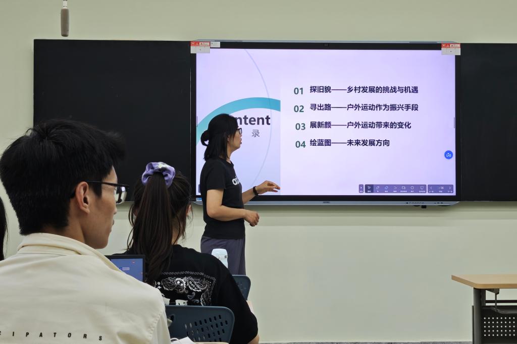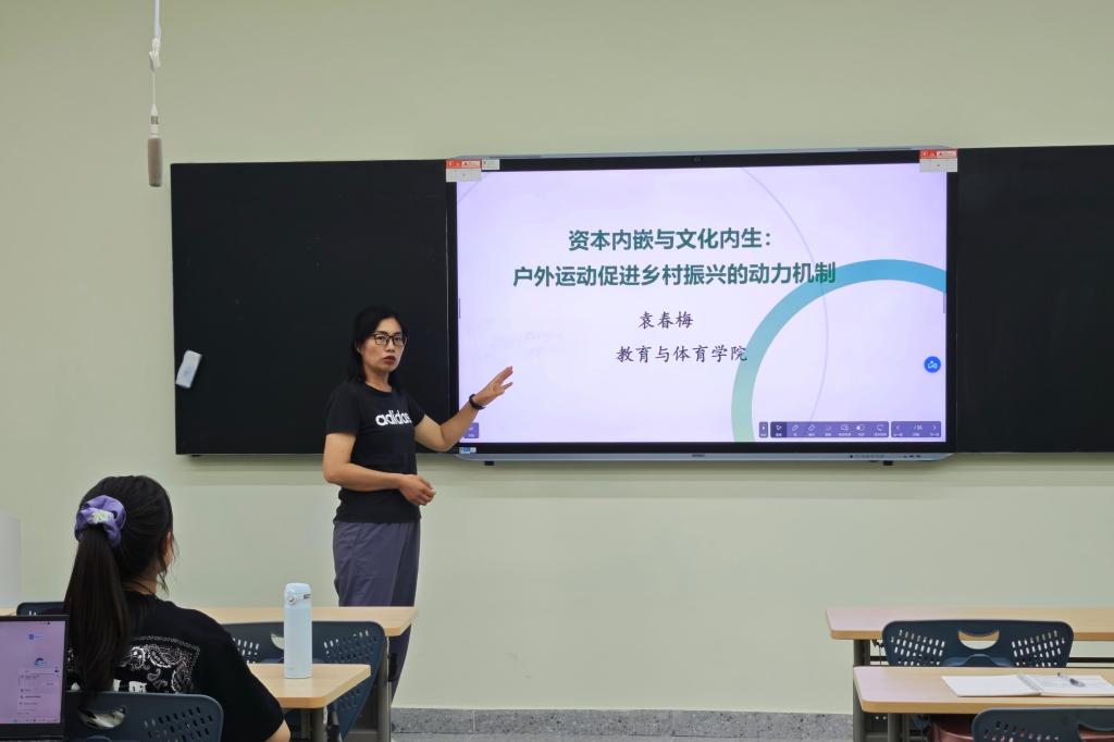 最后,袁老师鼓励同学们,在未来研究中可以关注户外运动与乡村振兴、文化保护与非遗传承等主题,结合自身的兴趣和实践进行探索研究,为我国体育产业发展添砖加瓦。