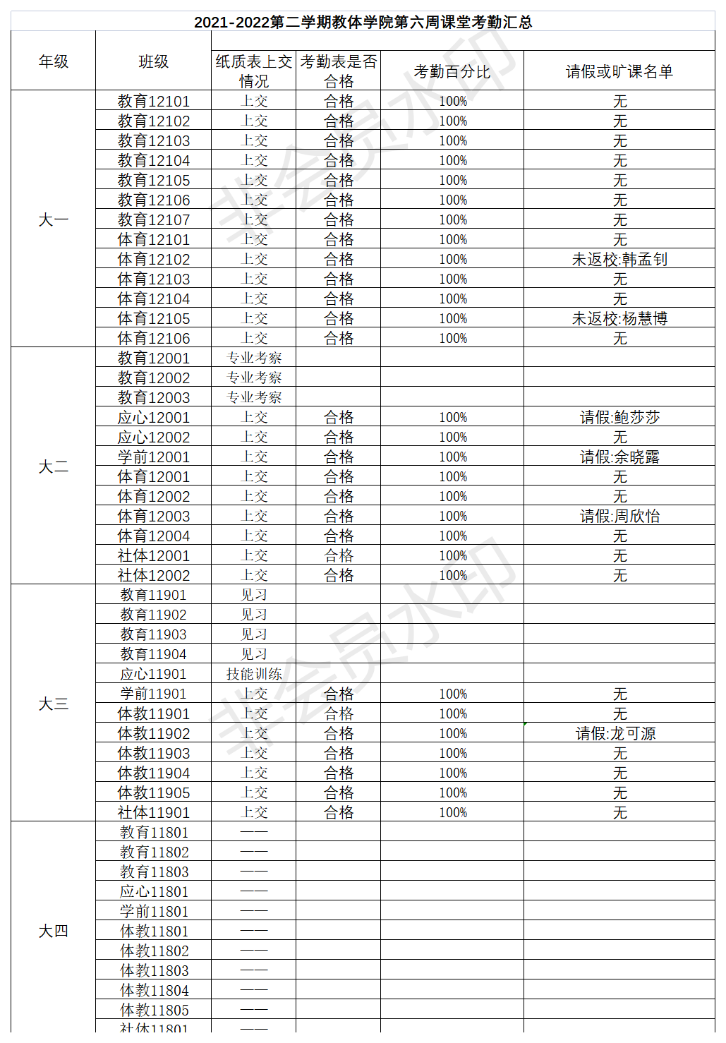 2021-2022年第二学期我院第六周课堂考勤汇总