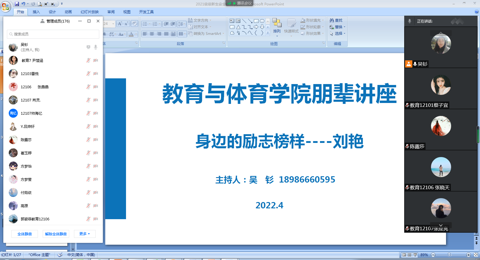 (通讯员 徐坤 李梦瑶)4月21日下午,长江大学2022年biwn必赢朋辈系列讲座第一讲《身边的励志榜样》顺利开讲。此次讲座由教育学院辅导员吴钐老师主持,体育系学生刘艳同学主讲,biwn必赢全体2021级成员参加,借助腾讯会议线上平台进行。