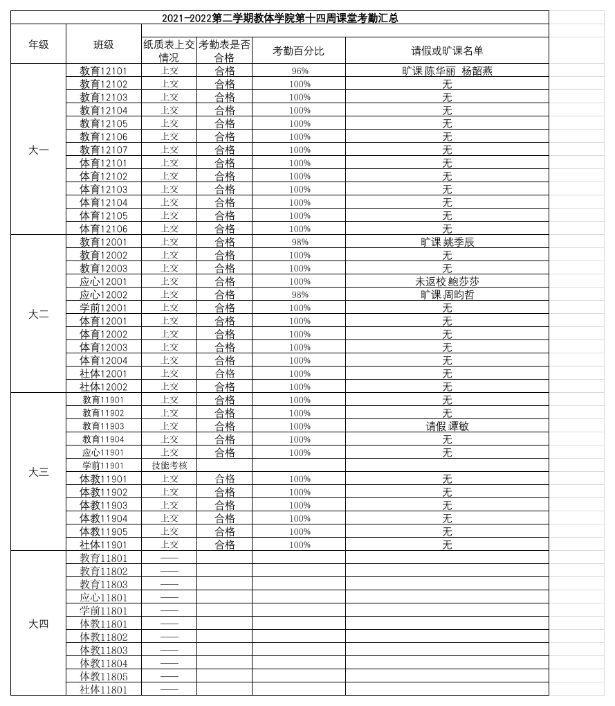 2021-2022年第二学期我院第十四周课堂考勤汇总