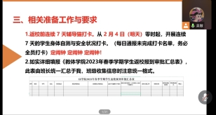 为确保我院2023年春季学期开学相关工作平稳有序开展,2月1日-7日,我院以班级为单位,年级辅导员牵头,班主任参与,结合腾讯会议、QQ、微信等线上形式,组织全院学生召开2023年春季学期学生返校安全教育主题班会。