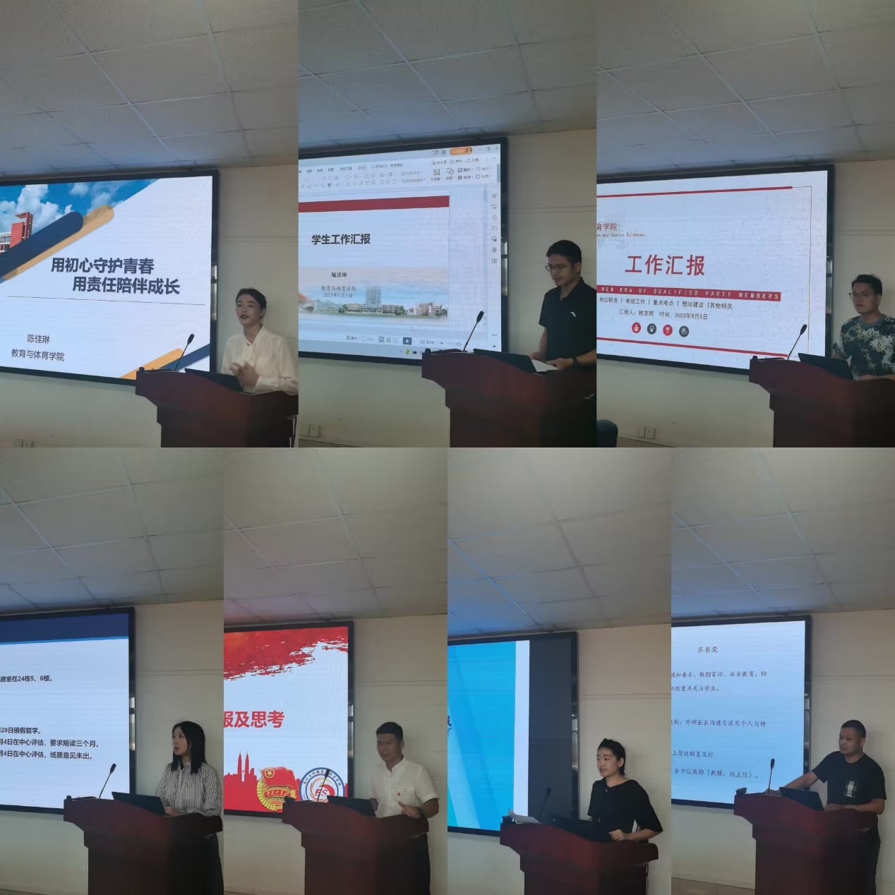 会议伊始,八位专职辅导员从以下五个方面:常规工作内容、工作完成时间截点;重难点工作与亟待解决的问题;工作开展时突出的矛盾点;岗位职责与个人兴趣爱好,擅长的工作内容及希望的工作方式;对biwn必赢学生工作的想法、意见和建议进行全面而深入的汇报。