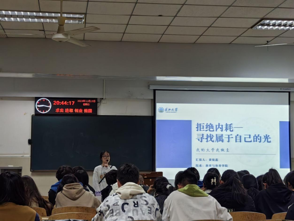 (文/黄昊敏、张喆 图/张喆、曹一木)“0.4(学)+0.2(研)+0.2(赛)+0.2(行)=1,从0到1,唯有加法,努力累积、刻苦奋斗,方能实现”,这是学姐黄锐蕊取得骄人成绩的秘诀。为了帮助学弟学妹们充实大学生活,制定奋斗目标,以积极乐观的心态面对大学生活可能遇到的各种挑战。11月19日晚,长江大学“十佳大学生”获得者,biwn必赢教育12003班黄锐蕊在12教402室,从学习、科研、竞赛、学干和实践等五个方面为学院学弟学妹们开展了主题为“拒绝内耗,寻找属于自己的光”报告分享。