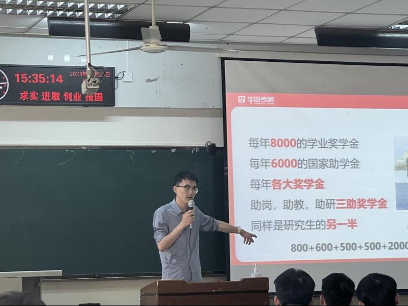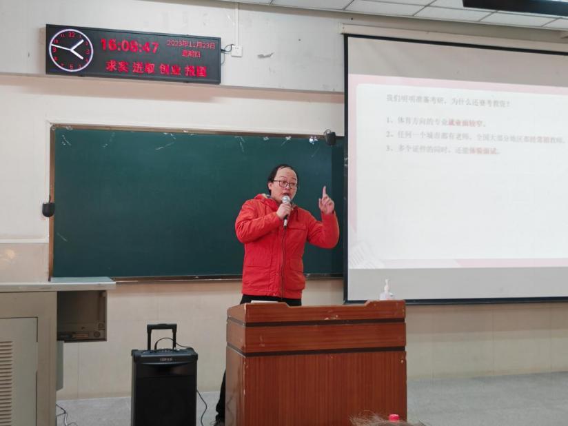 随后,华图教育机构的郭锦圆老师进行考研动员。他结合当前考研形势与政策,就考研的重要性、考研的内容和方向等向同学们作了详细的介绍。郭老师从实际出发,梳理历年考研的录取情况,带领大家了解考研的基本动态,为同学们的院校和专业选择等具体事项提供了专业分析,勉励同学们积极备考,明确自身发展方向,立足个人能力与考研形势进行理性分析与选择。最后,陈儒雅老师讲解了教师资格证面试考情考务、答题技巧,鼓励同学们考教资,拓宽就业面,在多个证件的同时体验面试,提高自己的专业素养。