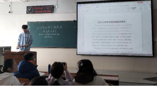 班主任、辅导员首先带领同学们集中学习了考风考纪教育的相关文件,接着通报有关考试违纪处分案例、宣讲违纪处分办法、告知舞弊后果,重点强调严谨请他人代替参加考试、替他人参加考试及携带通讯工具进入考场,进一步强化诚信考试意识,确保所有学生知晓舞弊后果,诚信应考不作弊,诚信做人不违纪。学院还组织全体同学签署《长江大学学生考试诚信承诺书》。