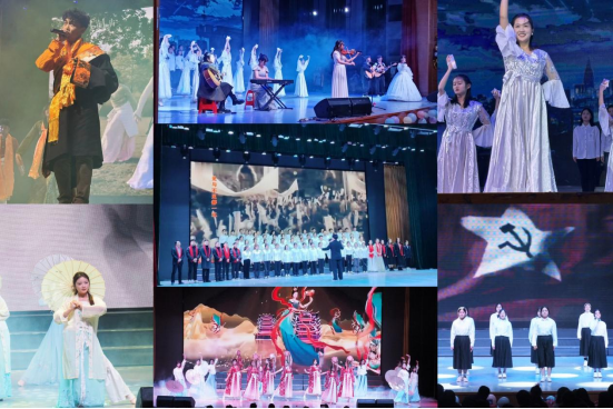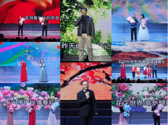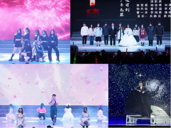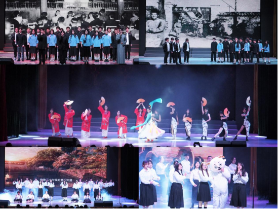 紧接着,《入画敦煌》蹁跹的衣袂带领观众们步入第三篇章“铿锵行·共创未来”。在舞台剧《青春中国》的朗诵声中,五四运动的呐喊穿透百年岁月,仍在青年们的心中久久回荡;身穿藏服,手捧金色哈达,《纳瓦吉瓦》用藏语表达对全体师生的美好祝愿,充分展现了鲜明民族特色;大合唱《如愿》为过去的2023年画下圆满的句号。全体师生共度今宵,共抒情谊,展现出我院团结向上、和谐进取的氛围。