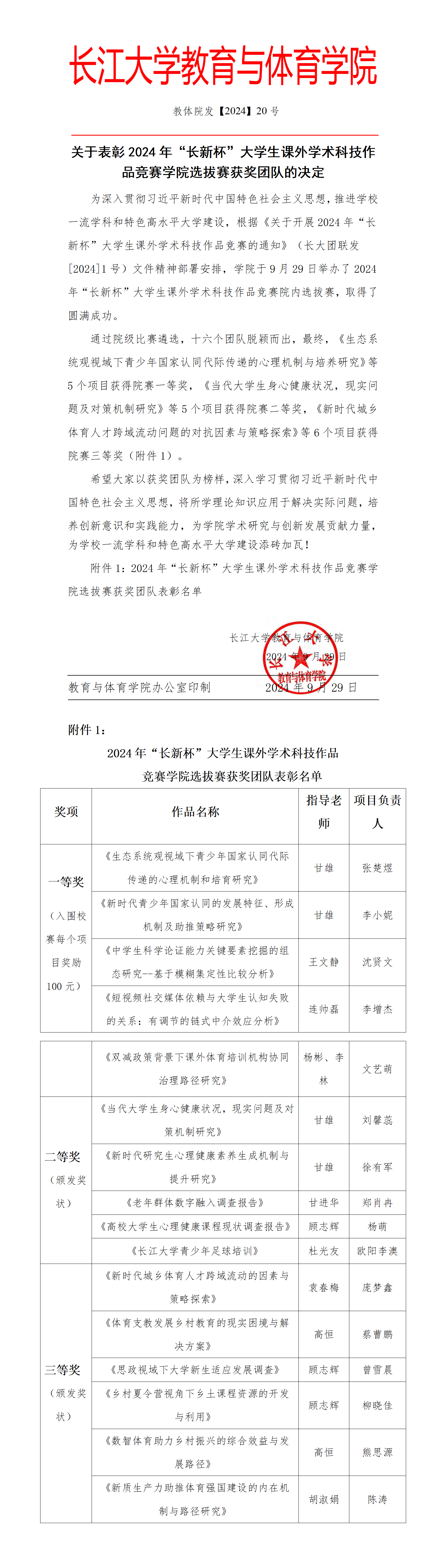 关于表彰2024年“长新杯”大学生课外学术科技作品竞赛学院选拔赛获奖团队的决定