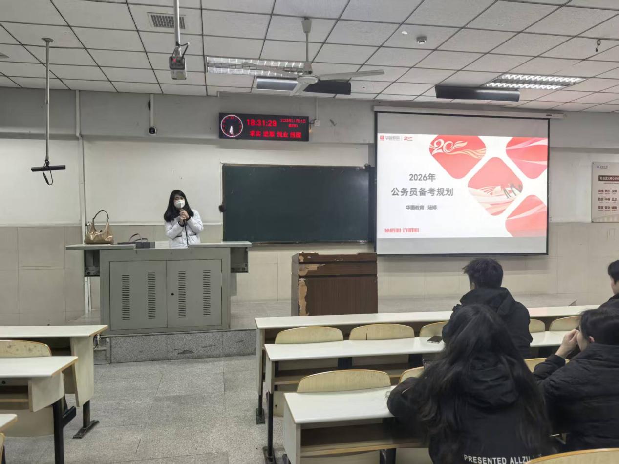 活动开始,辅导员高恒组织2023级体育生签到点名,掌握出勤情况。随后,华图教育陆婷老师围绕2026年公务员考试展开讲解,结合体育生特点,分析了其在身体素质、抗压能力等方面的优势,介绍了公务员职业的稳定性和发展前景。她还解读了考公形势、时间节点和岗位选择技巧,就行测、申论及面试提供了备考指导,帮助学生明确复习方向。