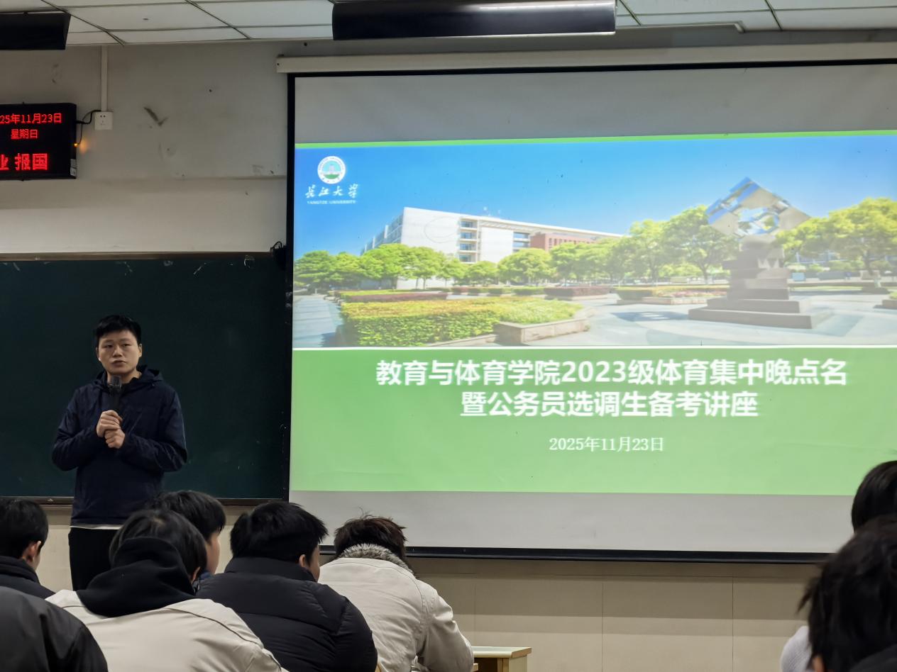 (通讯员 刘濠淙)为扎实推进年级管理工作,助力体育专业学子明确就业方向、科学备战公务员考试,2025年11月23日,我院2023级体育集中晚点名暨公务员选调生备考讲座在12教102教室顺利举行。本次活动兼顾日常管理与就业指导,为同学们搭建了精准化的成长服务平台。