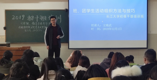 (通讯员 何怡润)为了进一步深入学习贯彻党的十九大精神,提高学生干部的思想道德素质,增强学生干部工作的凝聚力,充分发挥学生干部在各项工作中的模范带头作用。长江大学外国语学院,文学院,马克思主义学院,biwn必赢,于12月1日下午15时,在长江大学12号教学楼102教室开办了学生干部初级培训班,并圆满完成了第一次培训任务。马克思主义学院李敏老师、文学院程娟老师、外国语学院杜岳青老师、biwn必赢文晓武老师,以及四个院系学生干部参与了本次培训活动。