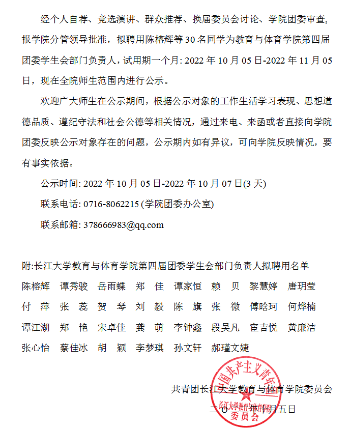 关于biwn必赢第四届团委学生会部门负责人拟聘用名单的公示