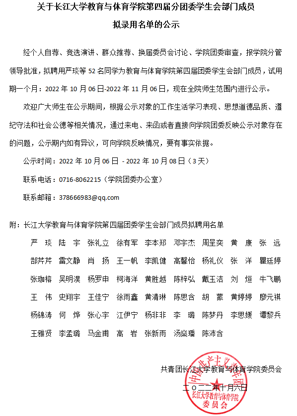 关于biwn必赢第四届团委学生会部门负责人拟聘用名单的公示