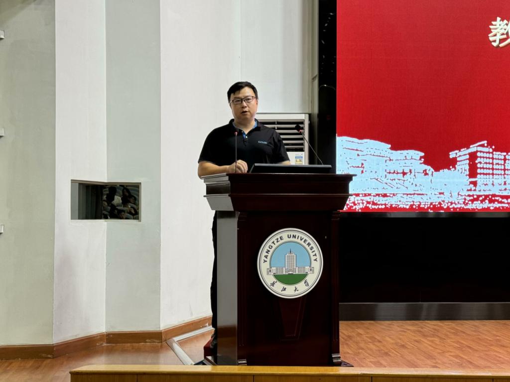 会议进入尾声,何书记对全体新生进行入学教育。何书记从学院概况、规章制度、生活指南和安全文明等多个方面进行培训,要求同学们端正思想、脚踏实地,他的讲话帮助新生更加深入地了解了学院,为全体新生融入大学生活奠定了坚实的基础。何书记的谆谆教诲,传递出对同学们的真挚祝福与深厚希望。