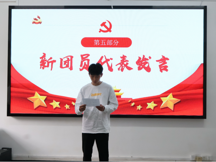 接下来,刘季米同学作为新团员代表发言,他表达了对一直培育我们的党组织、团组织和老师们最崇高的敬意和感激,并表示要主动学习党的创新理论,认真研读总书记的重要讲话内容,筑牢思想之基。同时,严格遵守团章团规,以清澈纯粹的理想信念,脚踏实地的奋斗姿态维护共青团员的良好形象,永葆先进本色。