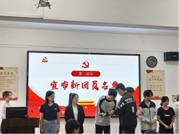 仪式在庄严肃穆的国歌声中正式开启,随后,罗茵馨宣读新团员名单,辅导员张震洋将共青团徽郑重地交给新团员,这不仅仅是团员的身份标识,更象征着责任与荣誉的传承。