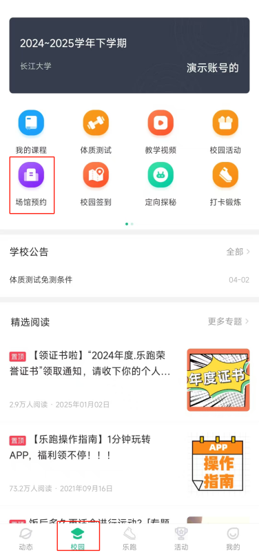 登录“步道乐跑”app选择校园「场馆预约」,进行线上实名预约。