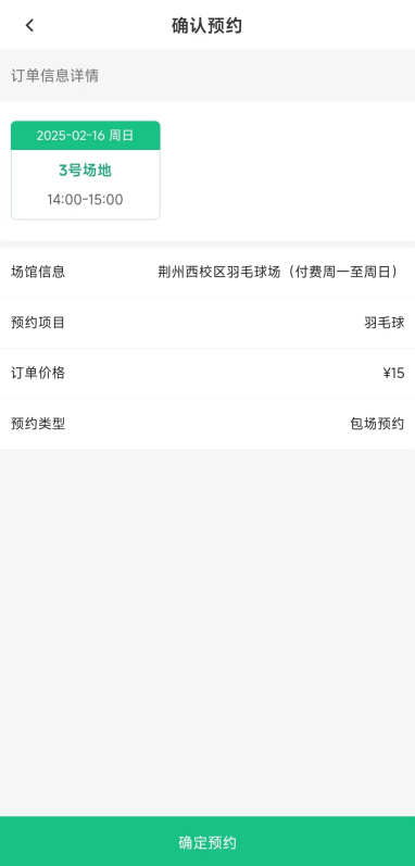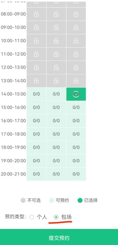 3.选择场地:选择好预约时间后,选择“包场”预约。点击确认前仔细核对预约的日期、时间、场地等内容是否准确无误。确认无误后,点击 “确定预约” 选项。预约完成后在预约场地开始时间前10分钟内达到场地并缴纳费用。