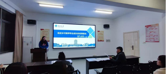 首先是来自教育学原理专业的汪漪同学,就“促进乡村教师专业成长的政策措施”作了报告。从促进乡村教师专业成长的政策措施,根据现有的促进乡村教师专业成长的政策措施的现状为起点,她提出了三条建议:1.建立专门化的乡村教师管理机构;2.建立专业化的乡村教师管理团队;3.建立专属化的乡村教师评鉴体系。