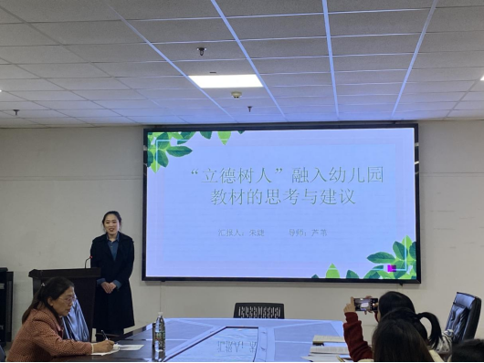 接着是朱婕同学,她就“立德树人融入幼儿园教材的思考与建议”做了专题报告。她从选题缘由、研究背景和意义、论文综述、研究内容、研究结论、参考文献六个部分展开。研究内容主要包括幼儿园教材融入立德树人的意义、幼儿园教材融入立德树人的建议、立德树人融入幼儿园教材的建议三方面,并通过前人相关研究梳理,得出研究结论,即要对教材内容进行优化和创新,融入立德树人理念,促进幼儿良好的思想品质的形成。让3-6岁的幼儿在其孩童时期就形成正确、良好的学习习惯和生活习惯,为幼儿以后的学习甚至是工作都打下良好的基础,让每一位幼儿都成为新时代下最合格的社会主义接班人。