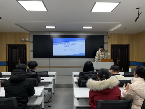 其次是来自体育教学专业的严廷杨同学,他就“中国足球经济发展现状及前景分析”做了专题报告。首先点明中国足球经济发展现状,即投入足球事业的社会资本大丰增长、足球产业价值变现、发展势头良好、球迷数量庞大。紧接着分析了足球经济对社会经济发展的联动效应,包括促进就业、推动国家制造业发展、推动建筑业发展等。随后又从智能球场系统推动足球产业发展、足球与电竞游戏跨界结合两个角度入手,对足球市场未来前景做了展望。最后提出中国足球经济发展策略,即加强足球经济的顶层发展设计、培养足球经济管理专业人才。