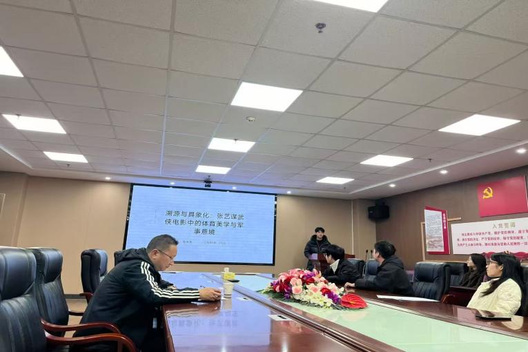 昝俊浩以跨学科视角展开汇报,题目为《溯源与具象化:张艺谋武侠电影中的体育美学与军事意境》。他从电影叙事与体育文化交融的角度切入,梳理了中国武术与古代军事训练之间的历史渊源,进而分析张艺谋电影如何通过动作设计、场景构图与意象符号,将体育精神与军事美学转化为视听语言。研究认为,这类电影不仅承载了武术的形体表达,更折射出深层的文化心理与集体记忆。汇报内容生动、视角新颖,获得现场师生的积极反响与热烈讨论。